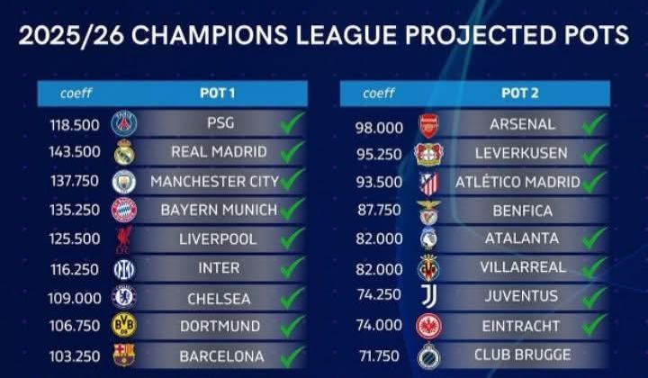 ‼️ π—’π—™π—™π—œπ—–π—œπ—”π—Ÿ: The pots for each team that qualified for the 2025/26 Champions League season. UEFA will conduct the draw tomorrow Thursday at 18:00 CET!
